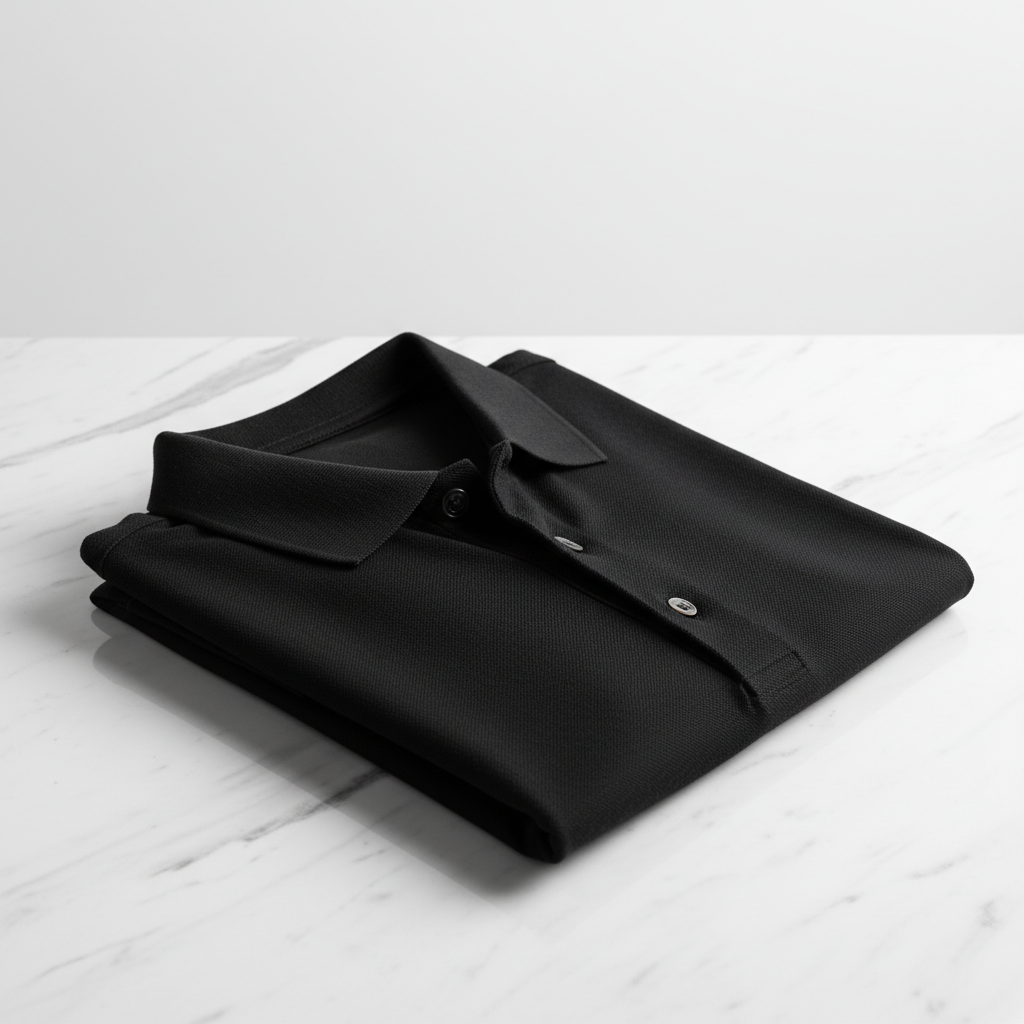 100% Pima cotton black polo with a tailored fit and high-density branding capability
