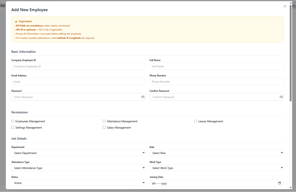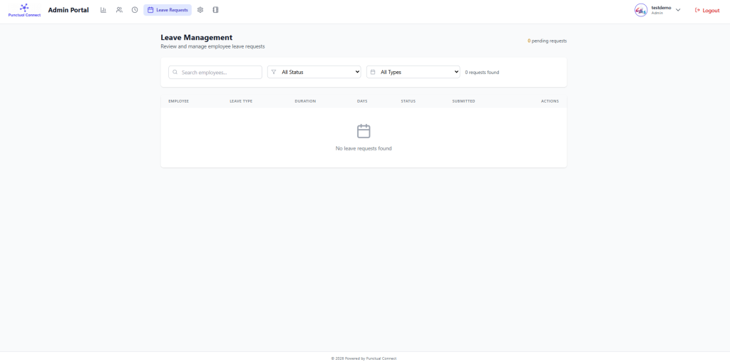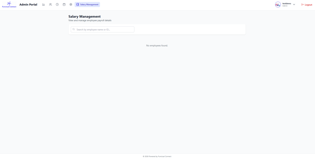 Provides a real-time overview of employee attendance and HR activity. Helps administrators monitor workforce status and pending tasks.