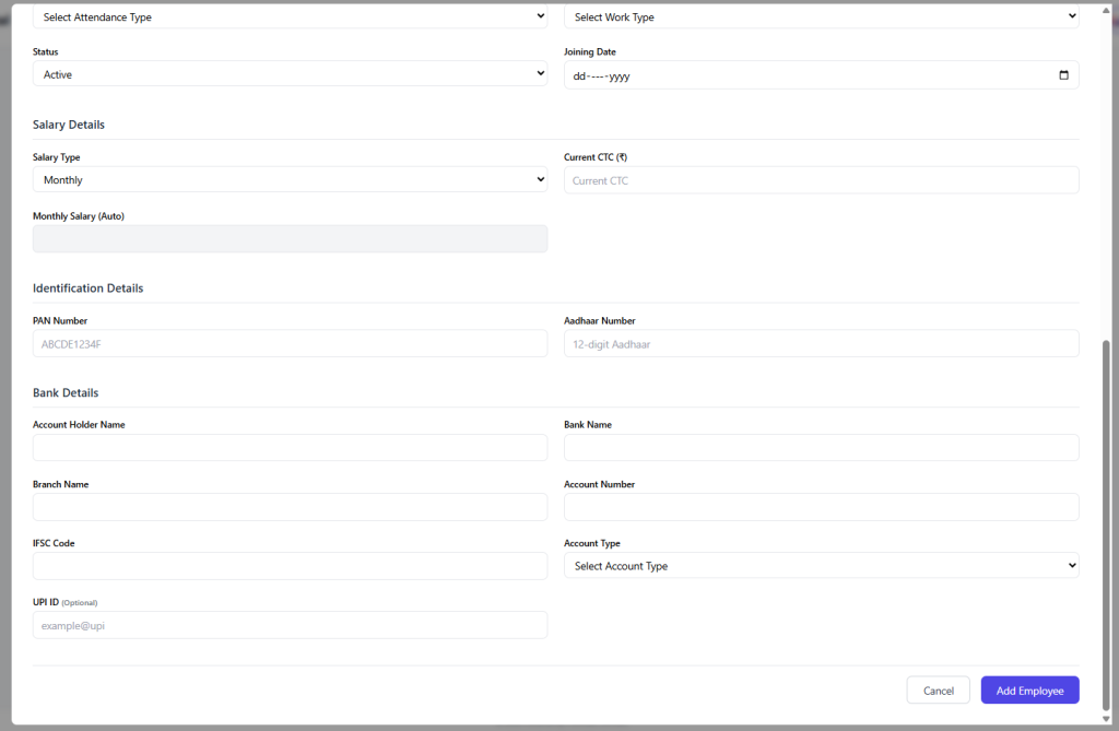 Used to add, view, search, filter, edit, and deactivate employees in the system.